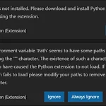 와...이거 진짜 30분남짓 끌어먹은 문젠데 제가 느낀 시간낭비감정(?)을 다른사람들은 느끼게하지않도록 글을 쓰겠습니당!파이썬을 해야해서 VSCode 쪽에 python 확장프로그램을 설치했다난 당연히 잘될줄알고 hello world 을 띄울려고하니 아래와 같은 에러를 뱉으면서 실행이 안됨 경고창을 보면 path 쪽에 " 이게 포함되어있다고 말하는데...정작 시스템쪽을 확인해보면 없어서 커맨드쪽에서 확인해야했다set path 을 치면 아래와 같이 나온다 6번째줄에 " 이게 있다 어떻게 지워야하나 했는데 그냥 진짜 지우면 된다 2번째 사진처럼 말이다그럼 제대로 실행된다 빠잉~~! 단지 set path 문자열 이렇게 넣어주면 된다 아래사진은 확인차에 찍은 사진이라... path 를 자바스크립트로 지정한거는 그..